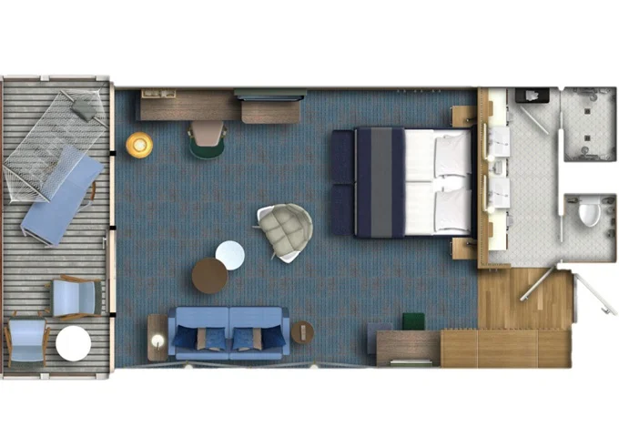 SKHO - Himmel & Meer Suite 42 m² + prekrytá terasa 29 m² na poschodí so stolom, ležadlami a s hojdacou sieťou. 14. paluba. Max 4 osoby. Výhody Suite. 16 947 € 5 649 € za osobu