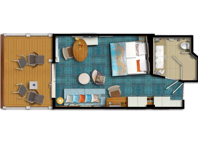 | VEPO - Kajuta s terasou Premium 17 m² + balkón 30 m² s 2 kreslami, 2 ležadlami a hojdacou sieťou. 7-11. paluba. Max 3 osoby. | 10 798 € 5 399 € za osobu |